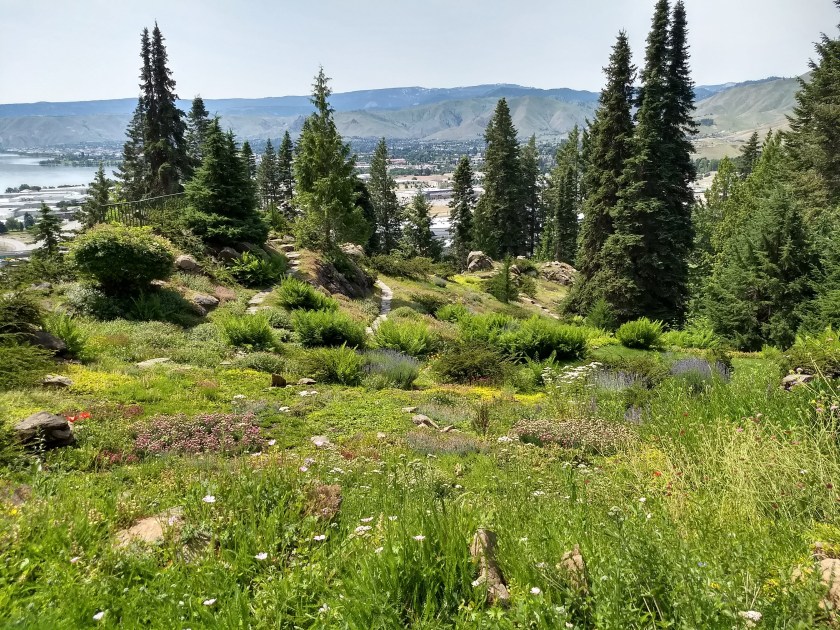 Our road trip has started well, with sunny weather, good food, and an open road. On Wednesday, we loaded up the car at Linda’s and headed east, over Blewett Pass to Wenatchee. There, we stopped to see Ohme Garden, a green and manicured oasis on the top of a hill overlooking the city and the Columbia River.