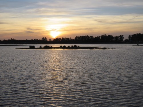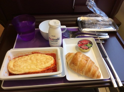 My train car wasn’t full, and my seat was by itself on the right side of the train. There were also a pair of seats on the other side of the aisle. After the train got started at 9:45, we were served breakfast. My second breakfast. An omelet in tomato sauce, a croissant, a yogurt drink, and choice of other beverages. Notice all the silverware I was provided – 6 pieces!