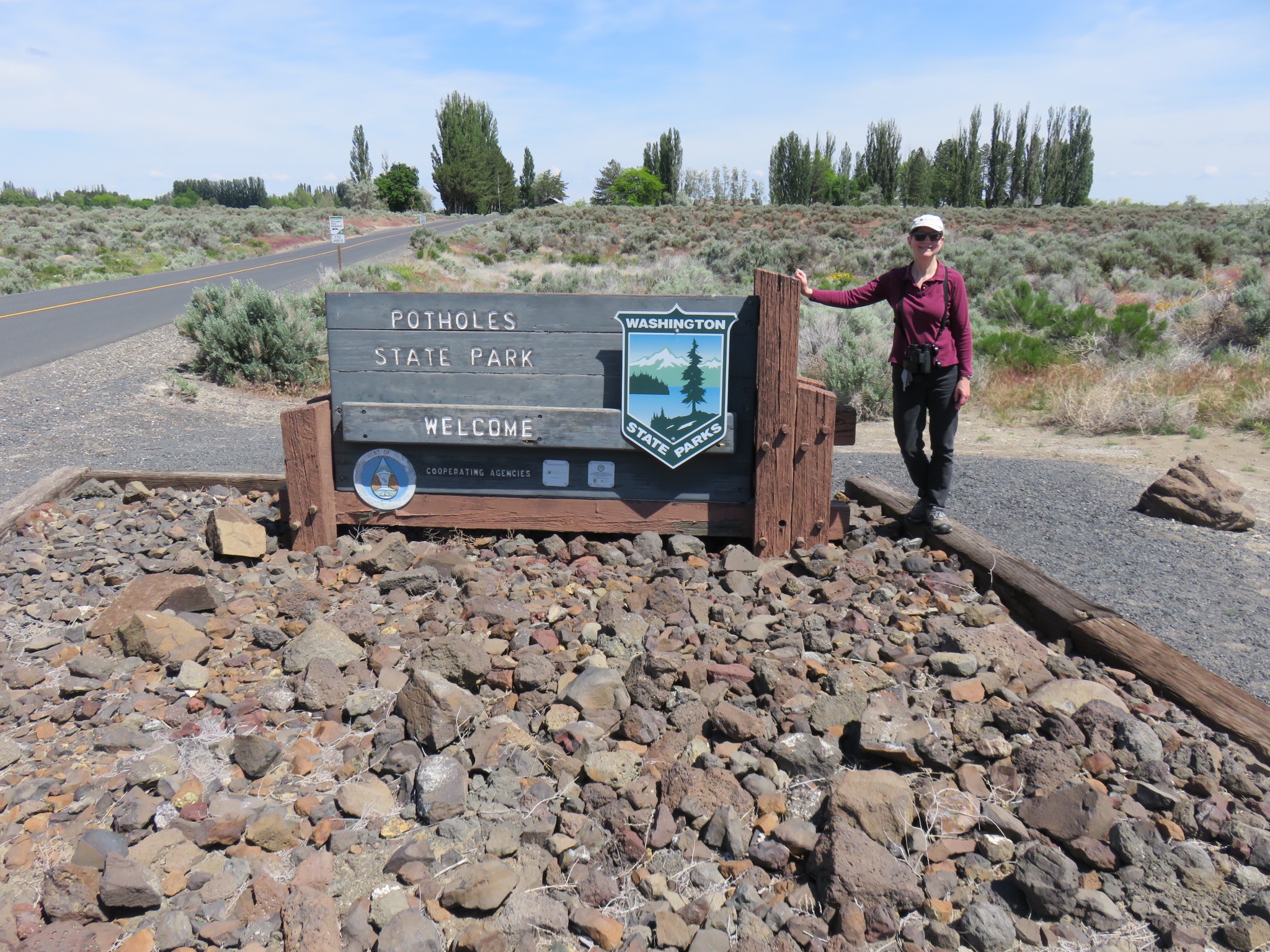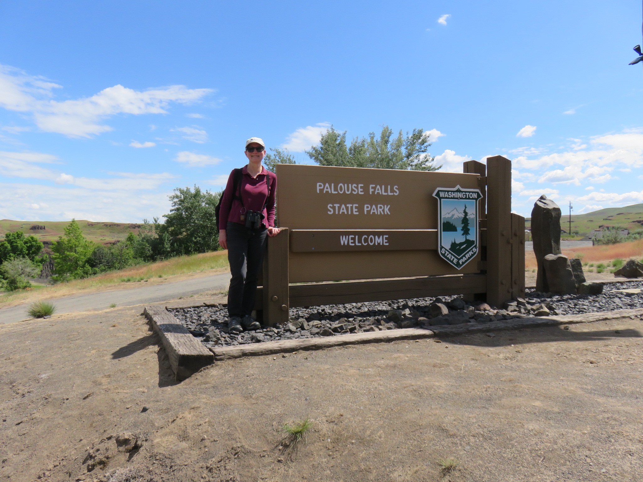 After sailing over Snoqualmie Pass from Issaquah, we took a right after Vantage, heading southeast on highway 26. Right away, it was easy country driving on a straight, 2-lane road through beautiful green fields and orchards, and hills with wildflowers blooming. I think we got lucky that it’s been a cool and wet spring, keeping the landscape verdant longer than usual. It was a wonderfully sunny day with little traffic on the road, making for easy driving.