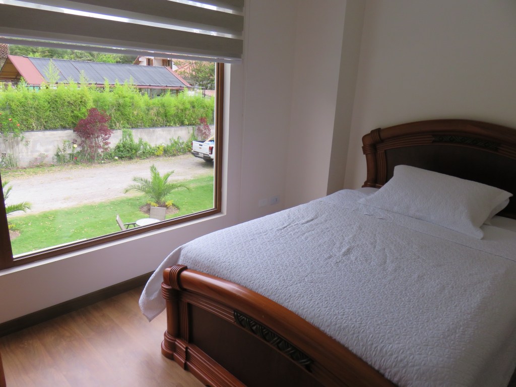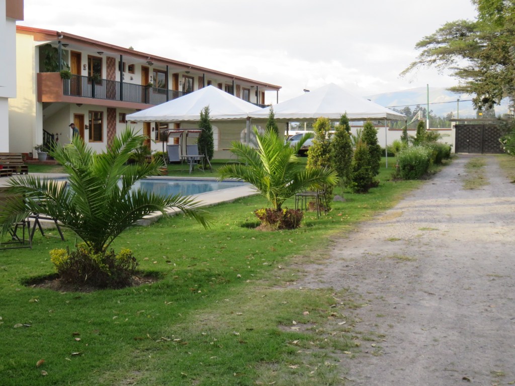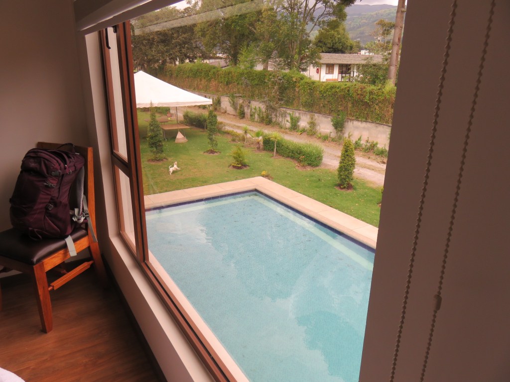 After landing in Quito, I got my luggage then walked across the street to the restaurants in the Airport Center and ate lunch about 2:30. Next I found a taxi for the 10-minute ride to my hotel. It’s a small hotel called Quinta San Felipe, in a residential neighborhood near the airport. The taxi driver knew just where to go, but I didn’t see any sign indicating it was a hotel from outside the gated drive. I have a small but modern room overlooking the pool. It’s $59 total, including dinner tonight and breakfast tomorrow, although I’ll need to leave before breakfast is served.