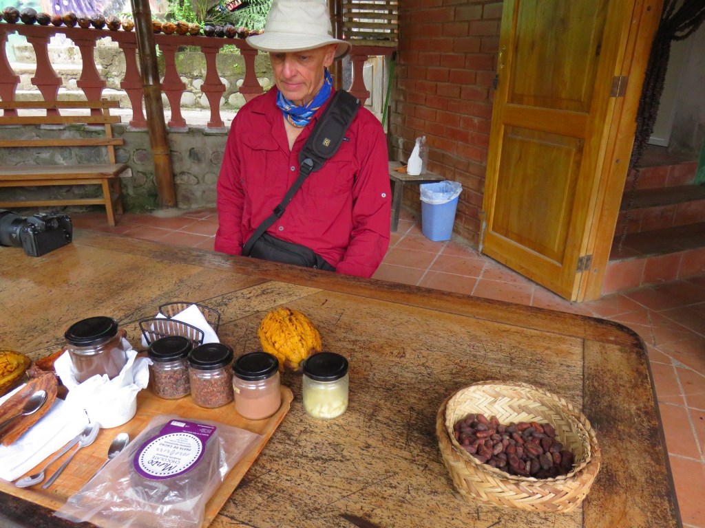 We ate savory crepes for lunch in an open air restaurant when we got back to town. Mine was chicken and mushroom, with a delicious passion fruit shake (batido in Spanish) to go with. After lunch, we walked to El Quetzal, a lodge and chocolate tour host. We went on a 1-hour tour of how they make specialty Ecuadorian chocolate. It was interesting and we got to try a few samples too.