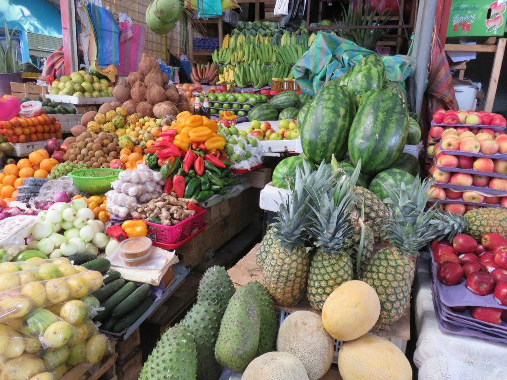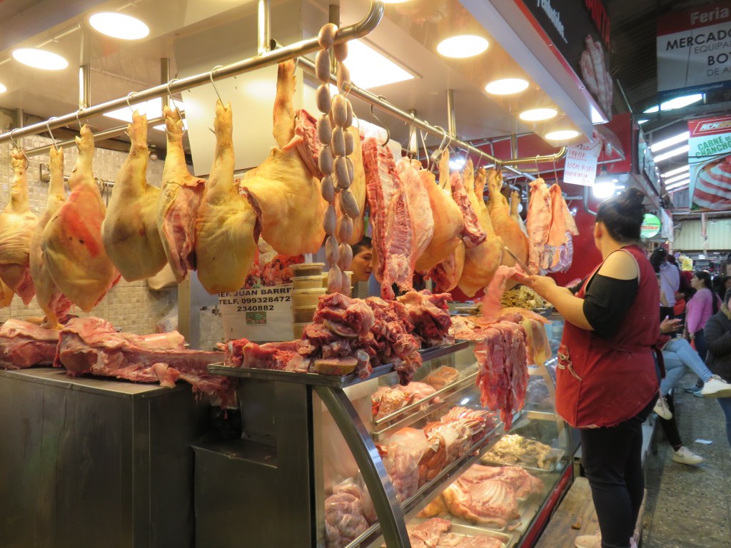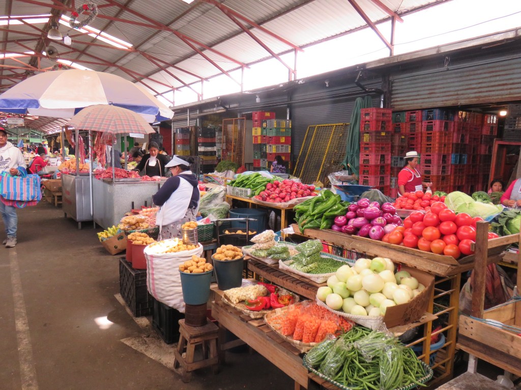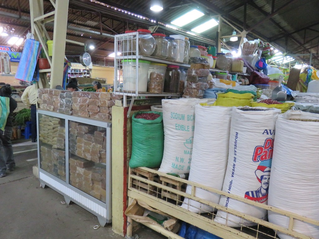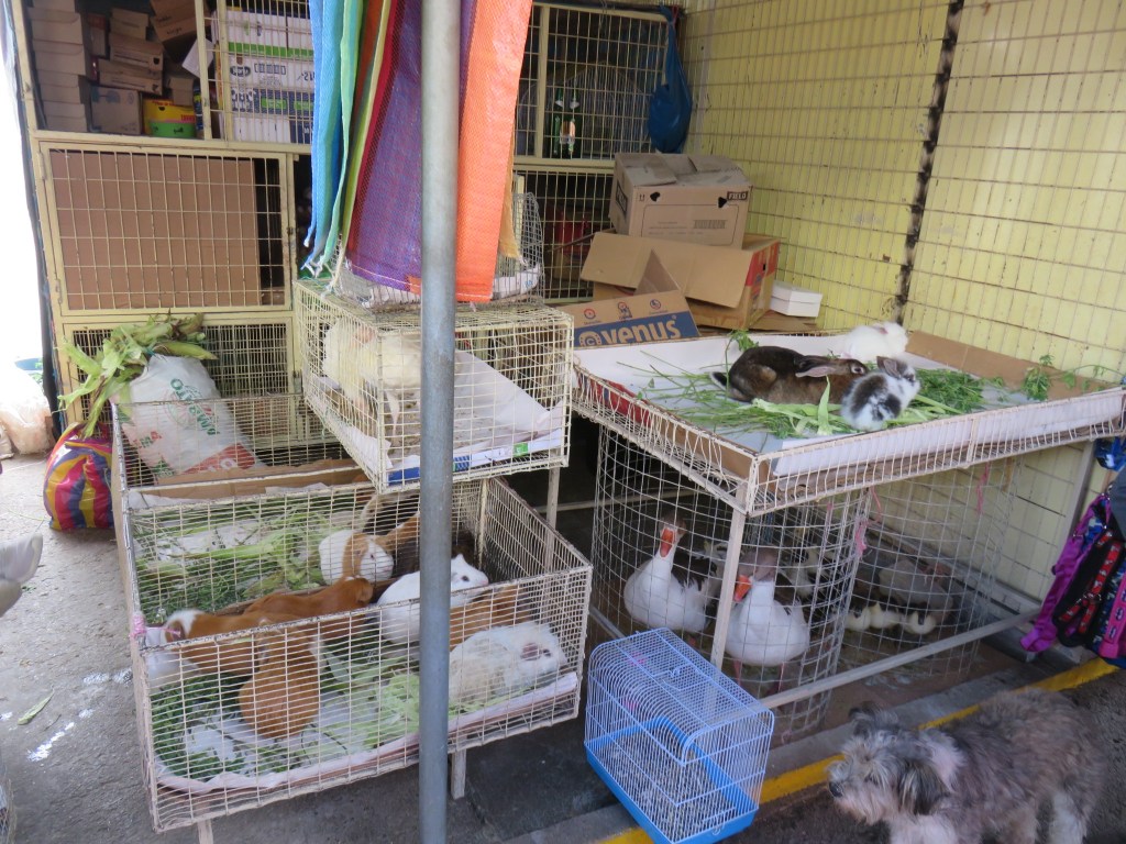 Brown panela sugar blocks and bags of beansButcher’s standRabbits, Guinea pigs, ducks, chickens and quail for saleAn egg vendorClothing, piercings, even haircuts are availableThere are many vegetable vendorsCloseup of fruits and vegetables
