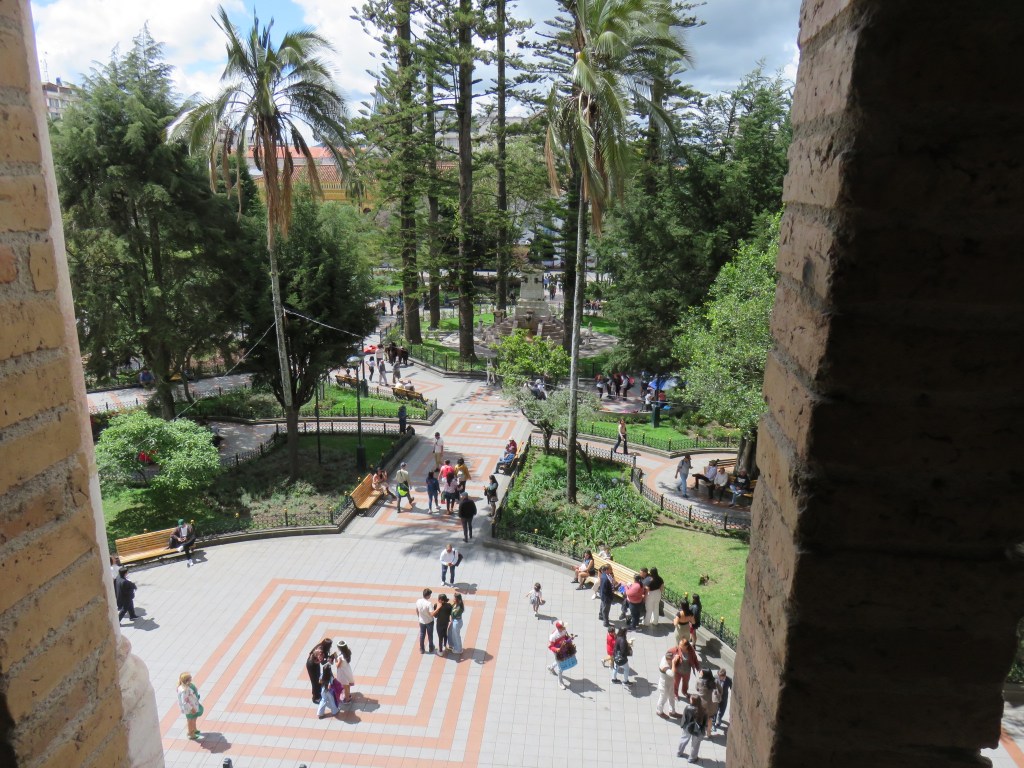 We brought Nathan’s produce back to the apartment, then left again, this time to take the Tranvía to the center of Cuenca. There, we climbed a tower of the Municipal Cathedral of Immaculate Conception for a view of the city and walked inside the cathedral. We ate lunch in a small restaurant adjacent to the central Parque Calderón, and then walked by many stands selling sweets and some selling flowers. The traditional sweets were being sold in stand after stand around the cathedral as part of Cuenca’s Corpus Christi celebration.