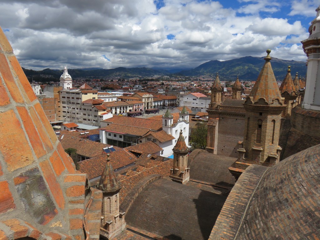 Friday was our travel day from Mindo to Cuenca. After our final breakfast at Cabañas Armonía, we packed our things and walked to the bus terminal on the other side of town. The 11 a.m. bus left on time, but stopped many more times on its way back to Quito than there had been going to Mindo. At several of the stops, food vendors got on to sell their wares and then got off at the next stop. Nathan bought pan de yuca, or cassava bread, from one of them. The small puffy rolls were still hot and quite delicious. $1 bought 4 rolls, which we enjoyed thoroughly. Our plan was to get off the bus at La Mitad del Mundo, a monument at the equator, and look around there before catching a taxi to the Quito airport. But because the bus was slower than we anticipated, we got off the bus at Mitad and skipped the sightseeing, immediately catching a taxi. We arrived at the airport about 1:30, giving us time to check my bag, eat a quick lunch next to the gate, and board in time for our 3:15 flight on LATAM to Cuenca.