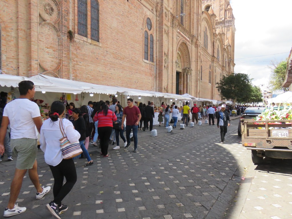 Sign about the cathedralThe back of the Municipal Cathedral of Immaculate Conception Front of the cathedral. We climbed the left tower.Parque Calderón from the cathedral towerCuenca from the cathedral towerStands selling sweets for Corpus Christi celebrationEach stand sold so many different varieties of candies and pastriesThe flower marketThe central square and cathedral behind it