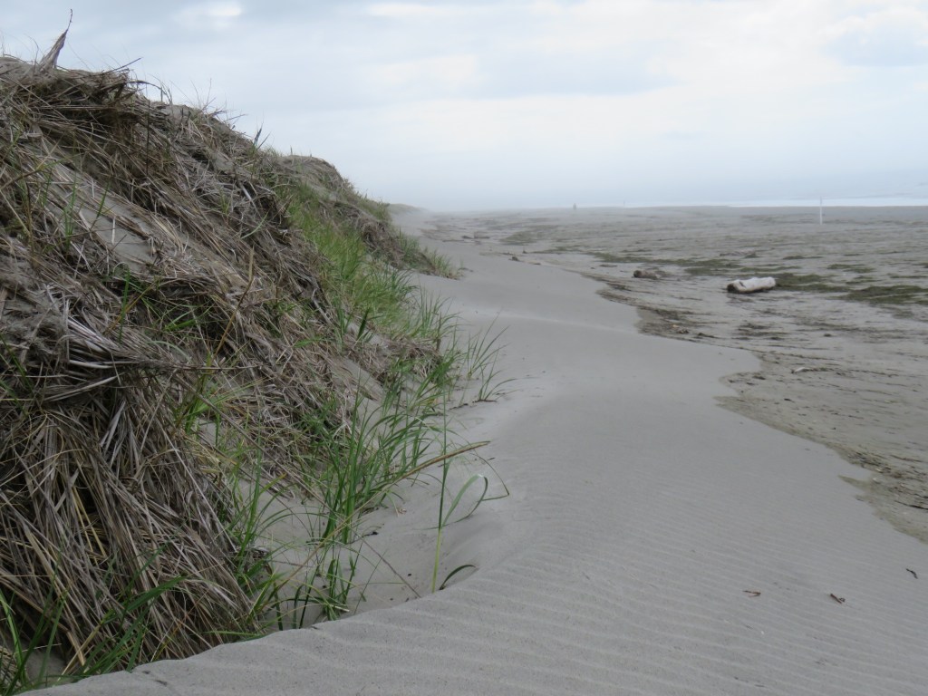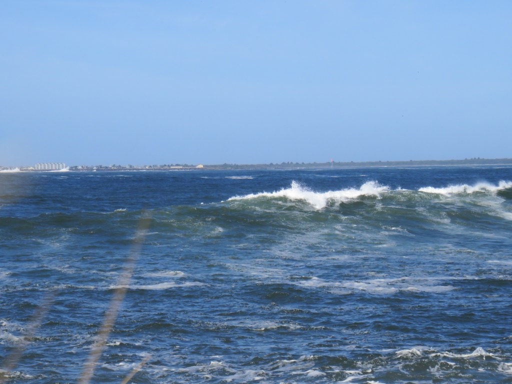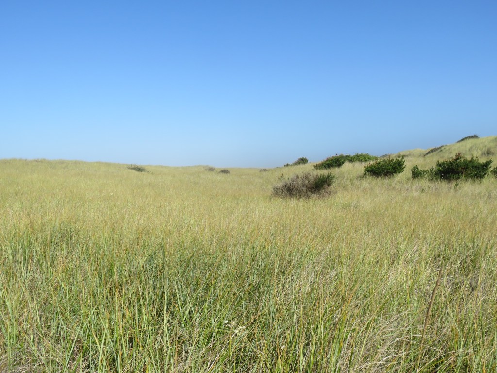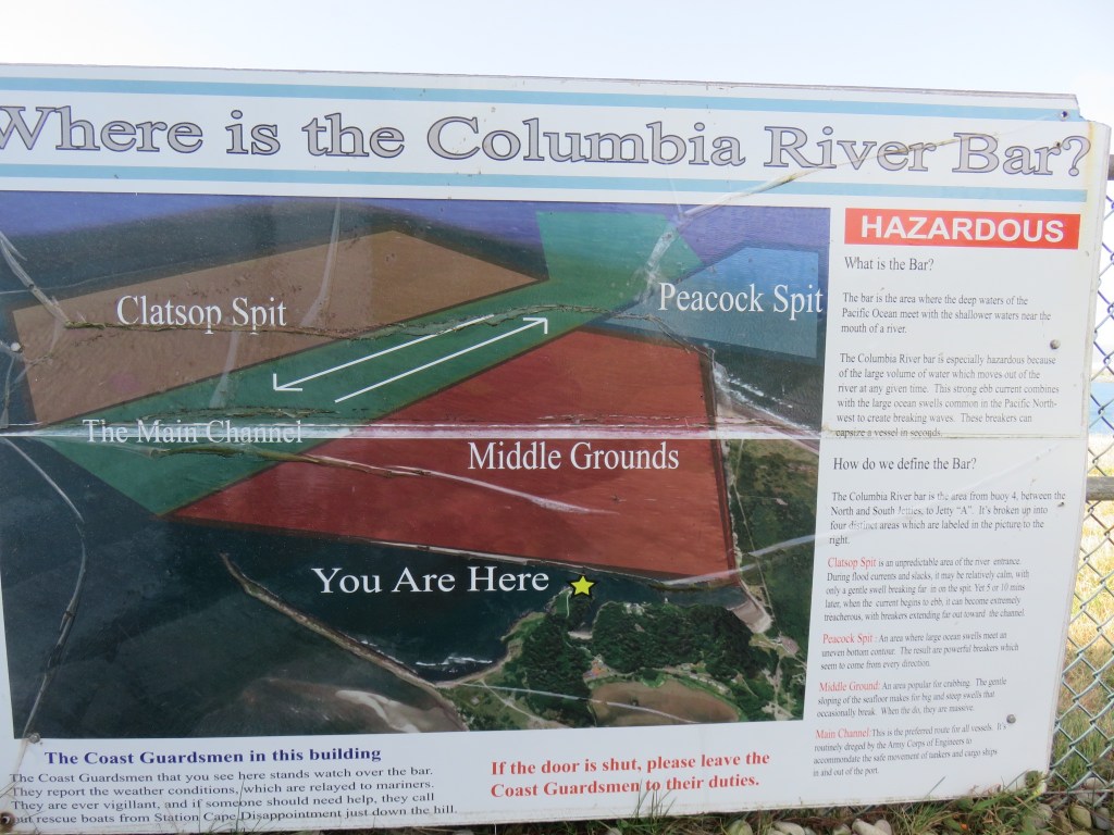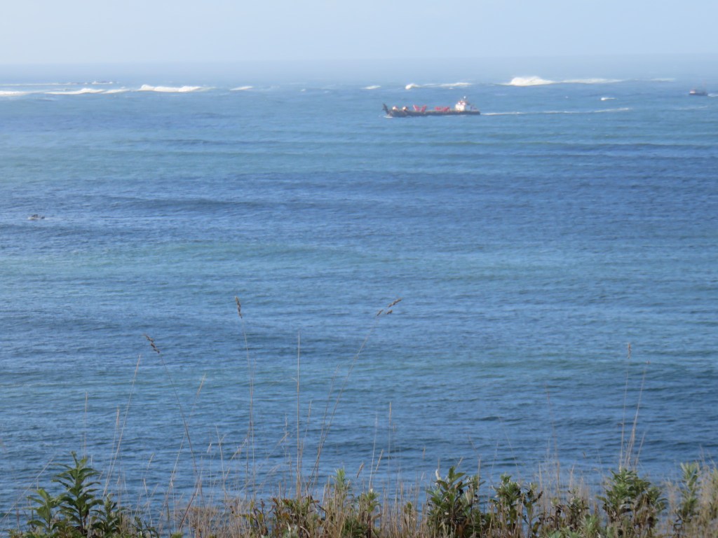 The lighthouse, constructed in 1856, wasn’t open to the public nor was the Coast Guard lookout that’s used once an hour to monitor bar conditions, but even so, it was a very interesting place. We watched a huge Manson hopper dredge ship actively dredging the main channel plus several identical Coast Guard boats out on training trips, dropping and retrieving floating man-shaped “buoys”. About 10:30, two Coast Guardsmen came to do their observations and then answered our questions about what we were seeing out there. We learned the CG boats were conducting boat handling training as part of a 2-week class for CG personnel. The dredge, which is probably contracted by the Army Corps of Engineers’ Portland District, dumps the sediment it collects along the sides of the area, next to the spits. And the CG has to go out and rescue someone every 2-3 days or so. We spent quite a while there enjoying the view and the beautiful weather. It wasn’t even windy.