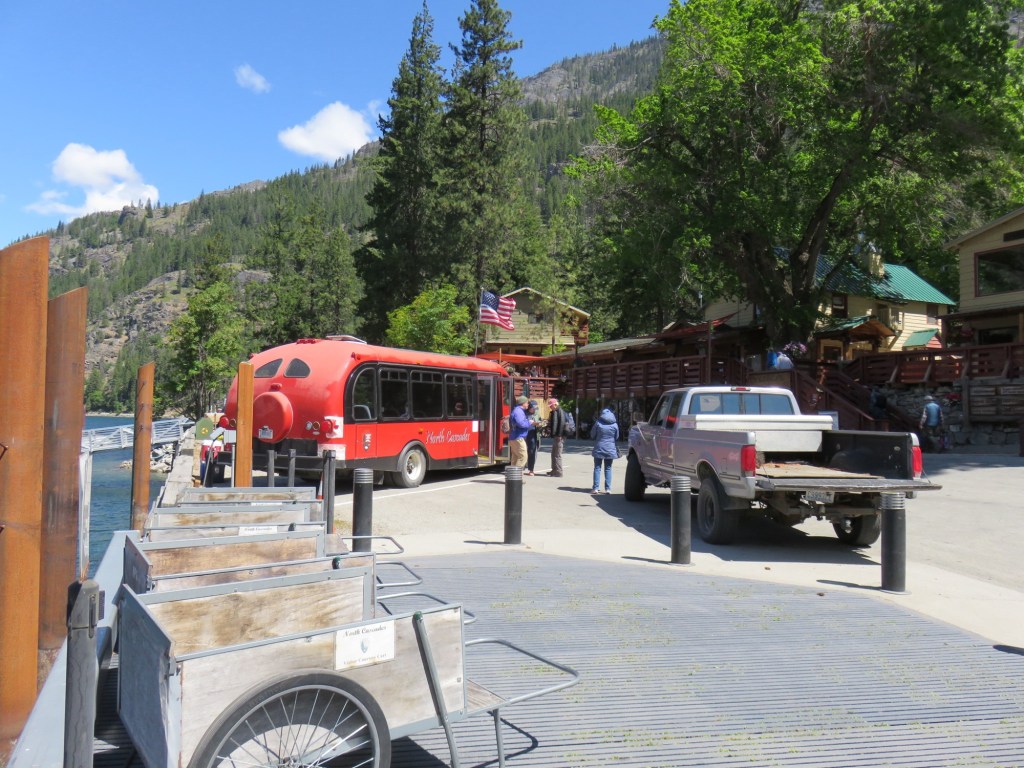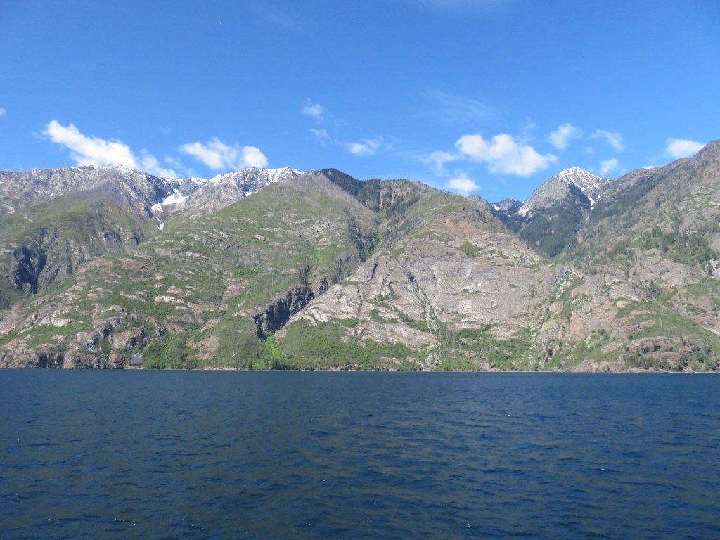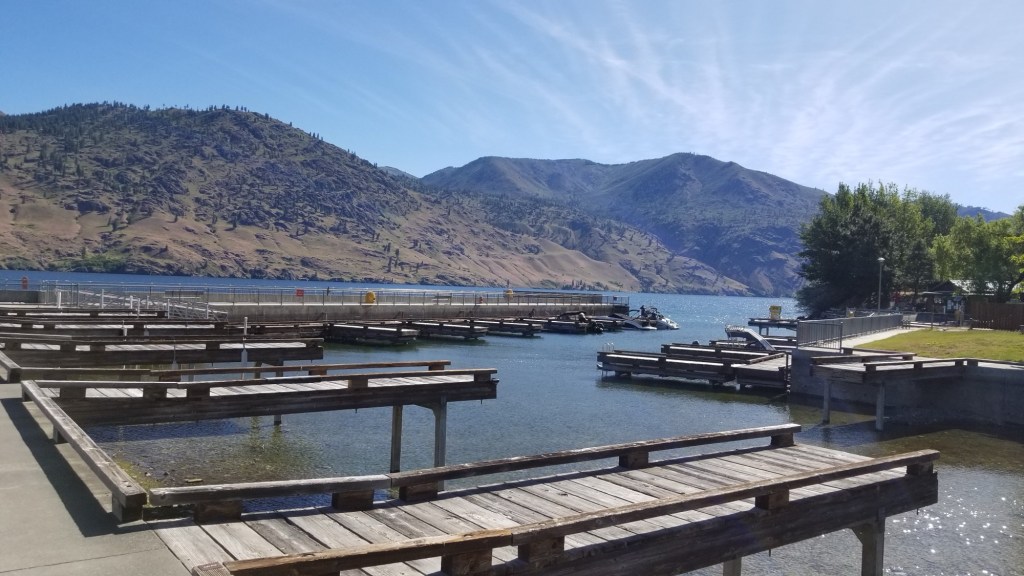 We began by going north along the western edge of Lake Chelan to visit Lake Chelan State Park and Twenty-five Mile Creek State Park. Both were very nice lakeside parks with docks. Twenty-five Mile Creek Park had an impressive concrete breakwater protecting a small marina from waves coming from the north. They must get some powerful north winds and waves there!