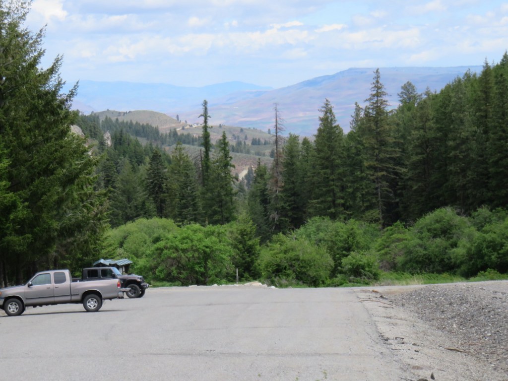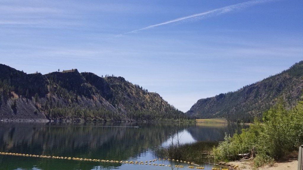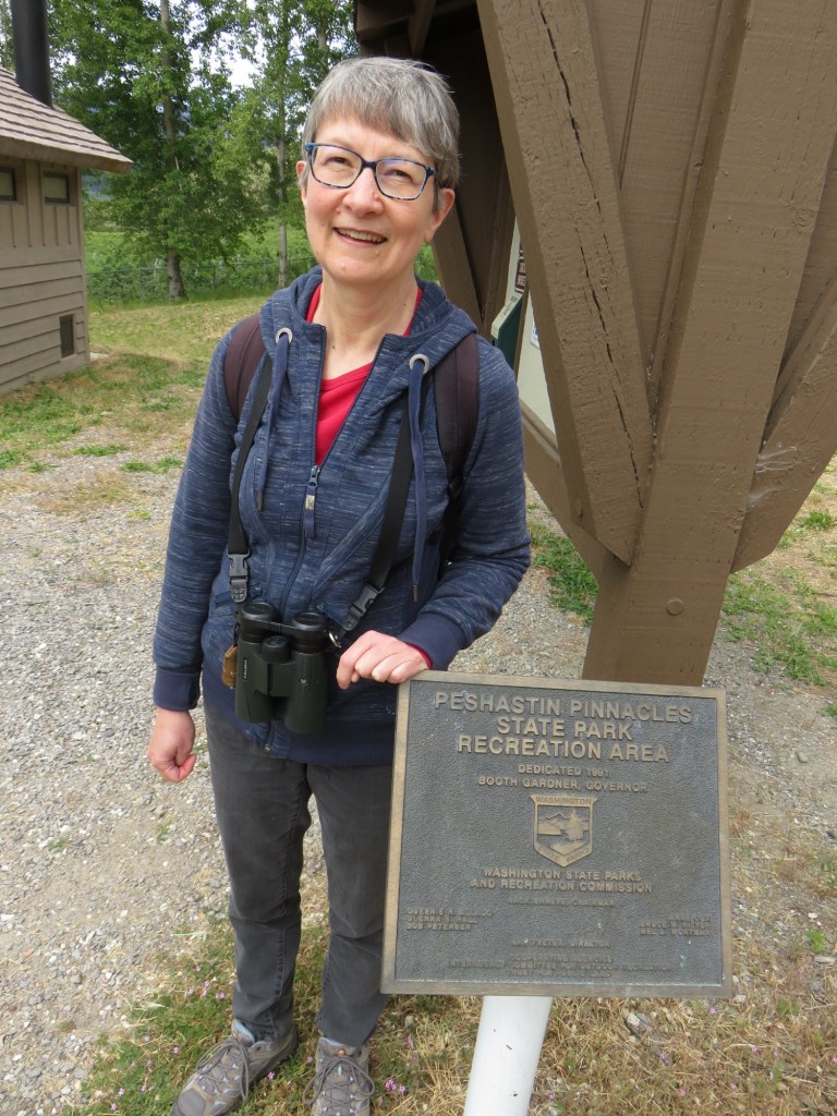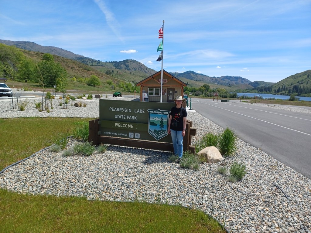 We drove through the Methow Valley, through Twisp and Winthrop, and noticed that Pearrygin Lake State Park was just a couple miles beyond Winthrop, so we decided to add that park to the day’s visits. When we stopped to take a photo of me and the park sign, I discovered that I no longer had my camera and also decided it wasn’t worth going back for because the 35-mile drive had been tiring and the Alta Lake park rangers didn’t answer the phone so I couldn’t verify that it had been turned in as lost. So it’s just lost (after serving me well for many years) and I’ll need to use my phone’s camera for the rest of the trip.
