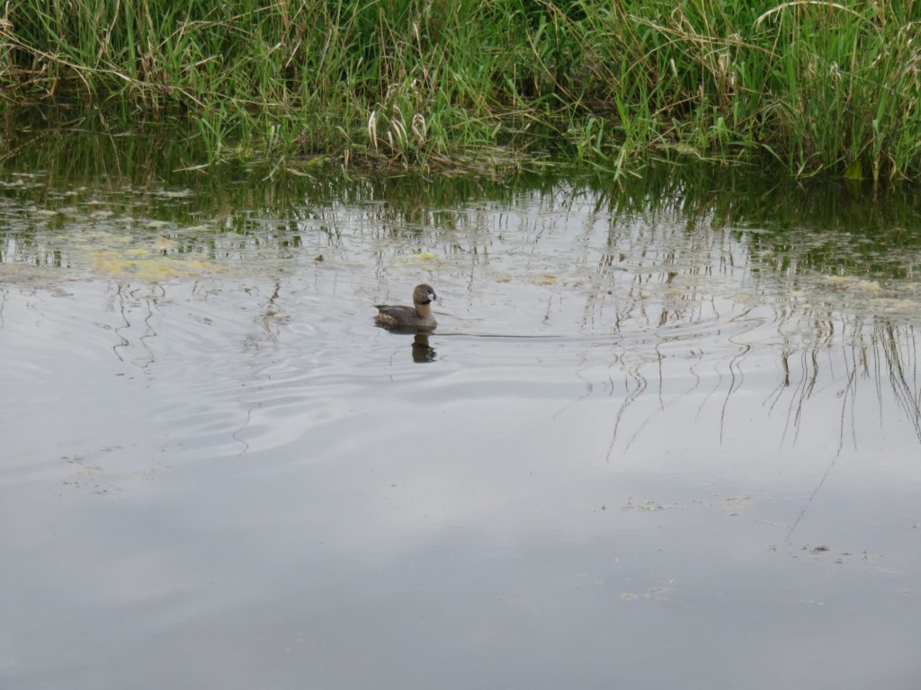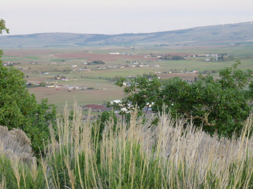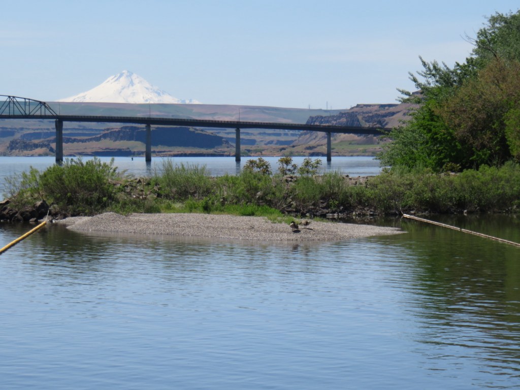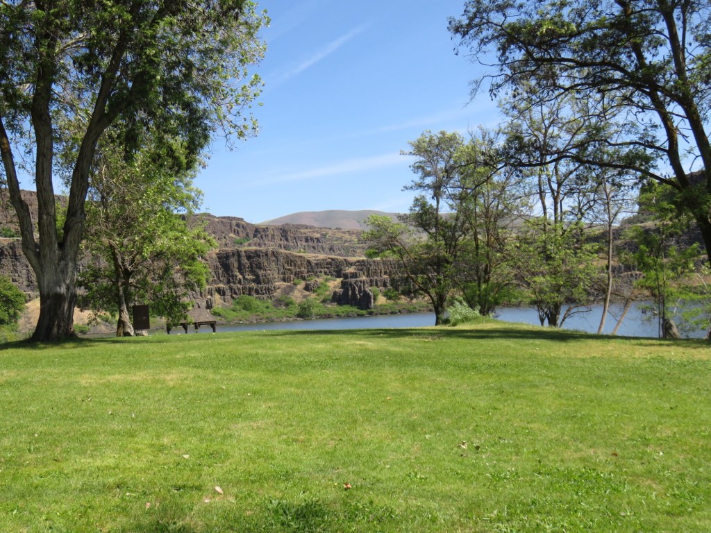 We ate lunch at the next park on my list, the Columbia Hills Historical at Horsethief Lake. The lake is one that was created by a railroad track berm that cut off a little inlet of the Columbia River. The park itself was large and grassy and provided a nice view of the river. We found a dry picnic table between running sprinklers, laid out a tablecloth and enjoyed a lunch of hummus leftover from last night’s dinner plus pita bread we had bought along the way. We saw some Brewer’s blackbirds in the trees around us, plus a Western kingbird and Yellow-rumpled warbler. Quite a pleasant place to eat lunch.