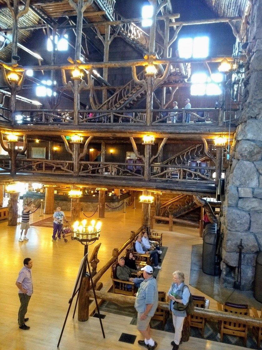 On Friday we went to Old Faithful first, staying to see it erupt twice at 9:45 and 11:17 from different viewpoints. We also walked around to see the other nearby geysers. We went inside the beautiful lobby of the venerable Old Faithful Inn, built in 1904, using wood and stone from the park. One of the room maids was even nice enough to show us one of the guest rooms that she had just prepared.