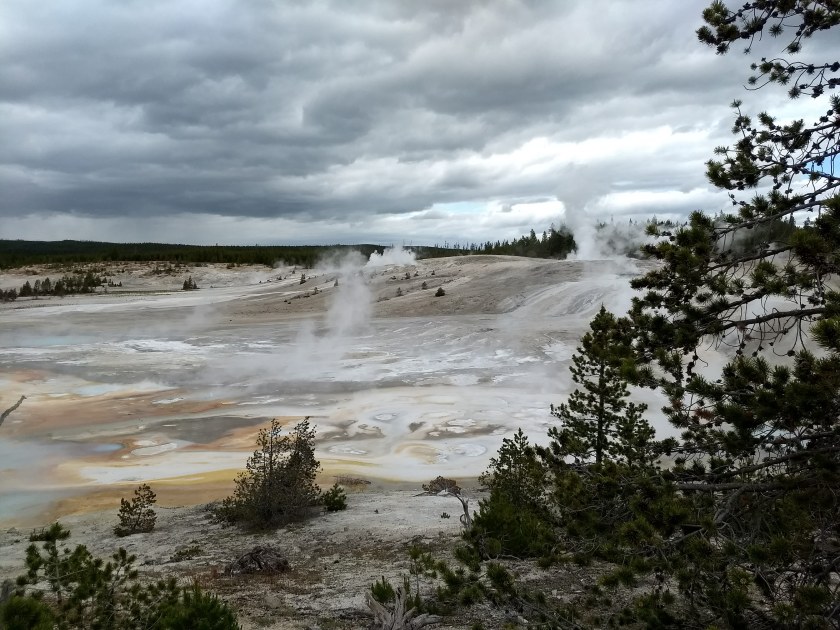 Then we drove to several other hot spring and geyser areas, seeing the Biscuit Basin, the Fountain Paint Pot, the Black Sand Basin, and geysers on the Firehole Lake Drive. Such amazing places. Due to afternoon crowds, we couldn’t park at the Grand Prismatic Spring site, so instead we ate a pleasant picnic lunch at nearby Whiskey Jack picnic area in the shade of the lodge pole pines.