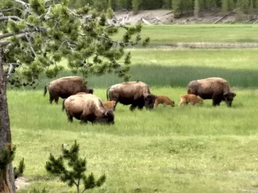 At several places along the road we saw bison. Big individuals grazing in the grass, a herd with calves among the trees, two bison chasing each other near Old Faithful, and even bison trotting along the road, causing a long line of cars in both directions to stop and wait for them to clear. A “bison jam.” And everywhere among the geysers, there are bison hoof prints and “patties” that show they spend time on the warm ground very close to the boiling thermal sites. We also saw a marmot near Old Faithful and interesting birds all around.