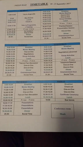 Angloville is going full swing now and the schedule is quite busy. From the time breakfast starts at 9 a.m. until social time is over at 10 p.m, except for a 90-minute break after lunch, we’re having conversations with the Poles. I’m really enjoying the conversations and learning about all the participants. Here’s the schedule (I hope you can see this):